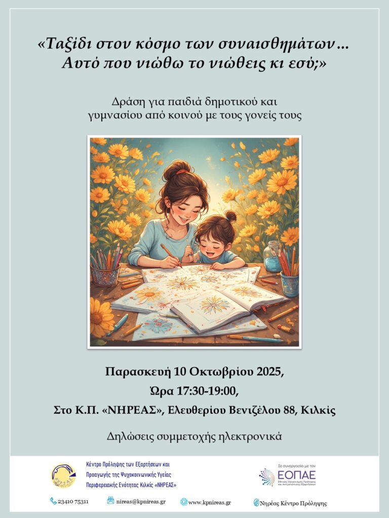 Το Κέντρο Πρόληψης των Εξαρτήσεων & Προαγωγής της Ψυχοκοινωνικής Υγείας Περιφερειακής Ενότητας Κιλκίς «ΝΗΡΕΑΣ» που λειτουργεί σε συνεργασία με τον Εθνικό Οργανισμό Πρόληψης και Αντιμετώπισης Εξαρτήσεων – Ε.Ο.Π.Α.Ε., με αφορμή τον εορτασμό της Παγκόσμιας Ημέρας Ψυχικής Υγείας, διοργανώνει την Παρασκευή 10 Οκτωβρίου 2025, ώρες 17:30 – 19:00, το βιωματικό εργαστήρι: «Ταξίδι στον κόσμο των συναισθημάτων… Αυτό που νιώθω το νιώθεις κι εσύ;». Το εργαστήριο απευθύνεται σε παιδιά που φοιτούν στο Δημοτικό και στο Γυμνάσιο και στους γονείς τους.