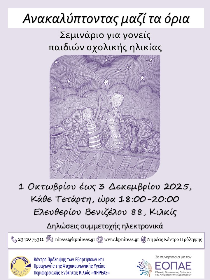Το Κέντρο Πρόληψης των Εξαρτήσεων & Προαγωγής της Ψυχοκοινωνικής Υγείας Περιφερειακής Ενότητας Κιλκίς «ΝΗΡΕΑΣ» που λειτουργεί σε συνεργασία με τον Εθνικό Οργανισμό Πρόληψης και Αντιμετώπισης Εξαρτήσεων-Ε.Ο.Π.Α.Ε. πρόκειται να υλοποιήσει μακροχρόνια παρέμβαση για γονείς παιδιών σχολικής ηλικίας με τίτλο: «Ανακαλύπτοντας μαζί τα όρια».