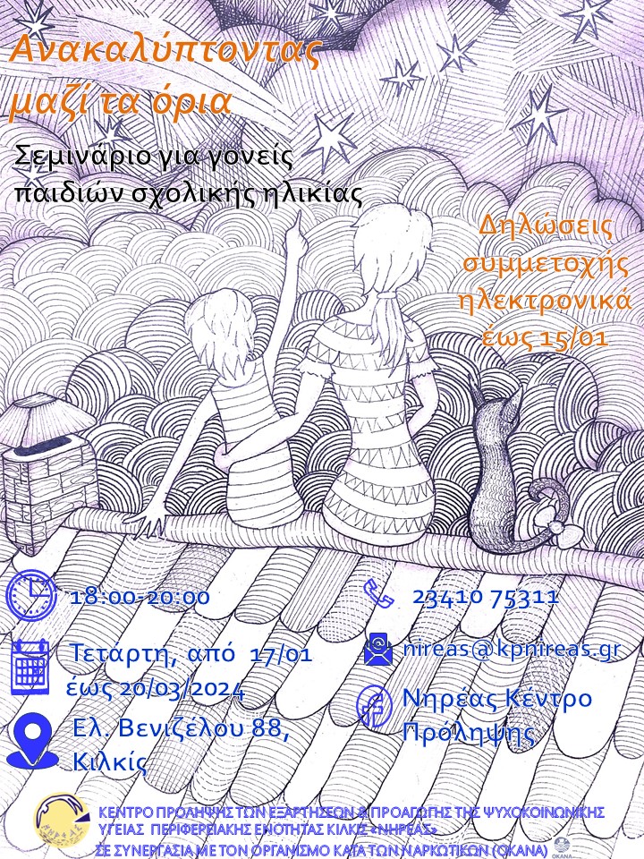 Το Κέντρο Πρόληψης των Εξαρτήσεων και Προαγωγής της Ψυχοκοινωνικής Υγείας Π. Ε. Κιλκίς “ΝΗΡΕΑΣ” διοργανώνει βιωματική ομάδα για εφήβους και έφηβες που φοιτούν στο Γυμνάσιο με θέμα: «Τα πατήματά μου… η διαδρομή μου». Η ομάδα αποτελείται από 12 εβδομαδιαίες συναντήσεις, διάρκειας 2 ωρών και θα πραγματοποιείται κάθε Πέμπτη, ώρες 17:00 – 19:00, στο χώρο του Κέντρου Πρόληψης «ΝΗΡΕΑΣ» (Ελ. Βενιζέλου 88, Κιλκίς). Η ομάδα θα ξεκινήσει στις 8 Φεβρουαρίου και θα ολοκληρωθεί στις 25 Απριλίου.
