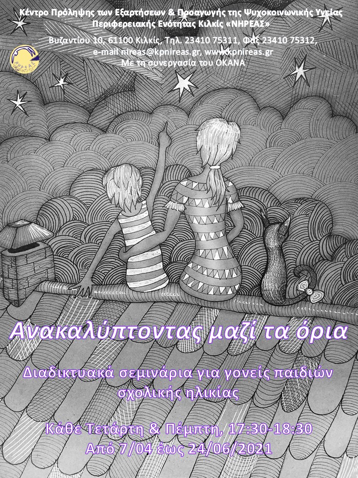 Το Κέντρο Πρόληψης των Εξαρτήσεων & Προαγωγής της Ψυχοκοινωνικής Υγείας Περιφερειακής Ενότητας Κιλκίς «ΝΗΡΕΑΣ» διοργανώνει διαδικτυακά σεμινάρια για γονείς παιδιών σχολικής ηλικίας με τίτλο: «Ανακαλύπτοντας μαζί τα όρια». Απευθύνονται σε γονείς/κηδεμόνες/φροντιστές (ανεξαρτήτου φύλου, κοινωνικό-οικονομικής κατάστασης, εργασιακής κατάστασης, εθνικότητας κ.ά.) που μεγαλώνουν παιδιά ηλικίας 6-11 χρονών και είναι μόνιμοι κάτοικοι της Περιφερειακής Ενότητας Κιλκίς.