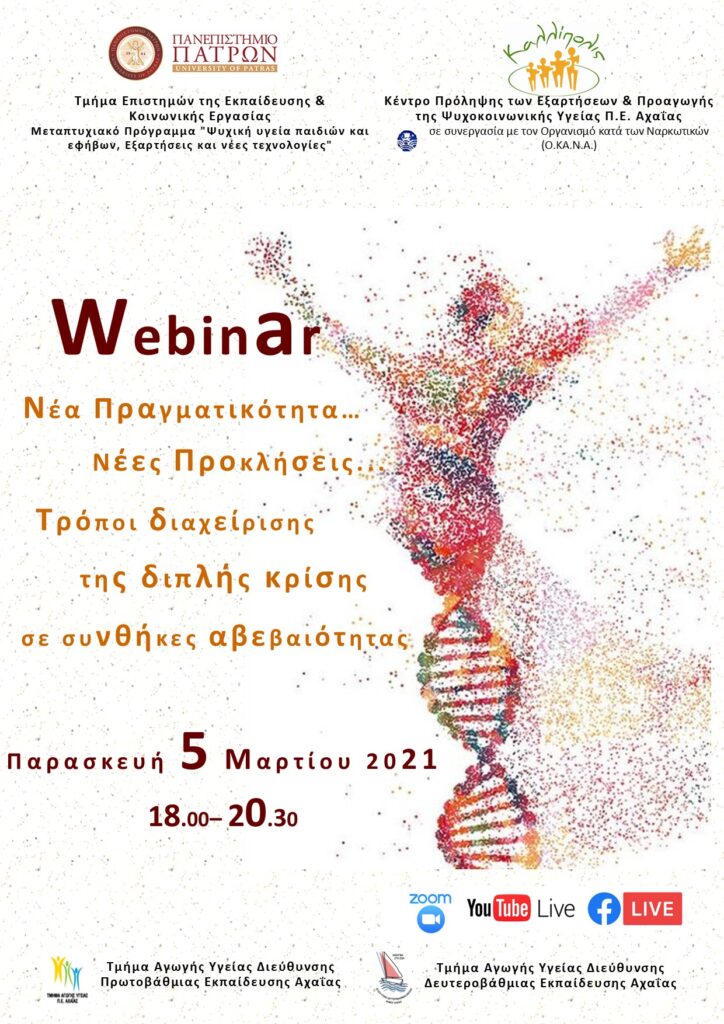 Το ΜΠΣ «Ψυχική Υγεία Παιδιού και Εφήβου, Εξαρτήσεις και Νέες Τεχνολογίες» του Τμήματος Επιστημών της Εκπαίδευσης και Κοινωνικής Εργασίας του Παν/μίου Πατρών και το Κέντρο Πρόληψης των Εξαρτήσεων & Προαγωγής της Ψυχοκοινωνικής Υγείας Π.Ε Αχαΐας «Καλλίπολις» σε συνεργασία με τα Τμήματα Αγωγής Υγείας Πρωτοβάθμιας και Δευτεροβάθμιας Εκπαίδευσης Νομού Αχαΐας, διοργανώνουν Διαδικτυακή Ημερίδα με θέμα: «Νέα Πραγματικότητα-Νέες Προκλήσεις. Τρόποι διαχείρισης της διπλής κρίσης σε συνθήκες αβεβαιότητας», την Παρασκευή 5 Μαρτίου και ώρα 18:00-20:30.