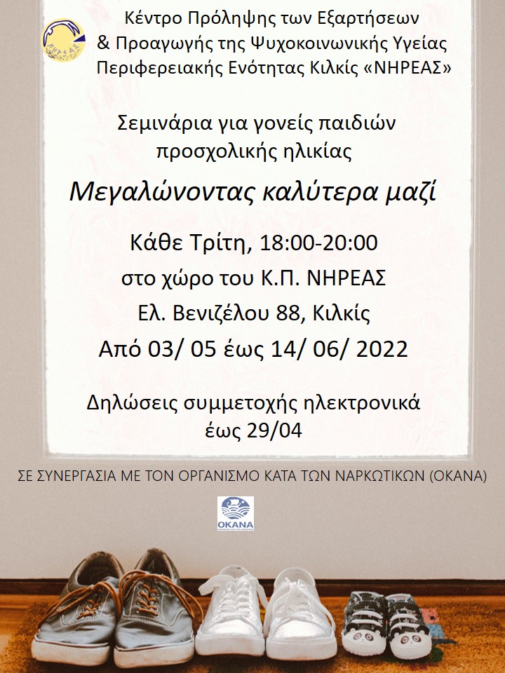 Το Κέντρο Πρόληψης των Εξαρτήσεων & Προαγωγής της Ψυχοκοινωνικής Υγείας Περιφερειακής Ενότητας Κιλκίς «ΝΗΡΕΑΣ» διοργανώνει σεμινάριο για γονείς παιδιών προσχολικής ηλικίας με τίτλο: «Μεγαλώνοντας καλύτερα μαζί». Απευθύνεται σε γονείς/κηδεμόνες/φροντιστές (ανεξαρτήτου φύλου, κοινωνικό-οικονομικής κατάστασης, εργασιακής κατάστασης, εθνικότητας κ.ά.) που μεγαλώνουν παιδιά ηλικίας 0-5 χρονών και κατοικούν στην Περιφερειακή Ενότητα Κιλκίς. Σκοπός της παρέμβασης είναι οι γονείς να υποστηριχθούν στο ρόλο τους, ενισχύοντας τις δεξιότητες τους που σχετίζονται με την εκπλήρωση του γονεϊκού τους ρόλου και συμβάλλοντας στην προαγωγή της ψυχοκοινωνικής υγείας των μελών της οικογένειας, ώστε αυτά να μπορέσουν να αναπτύξουν τα ταλέντα τους και να πραγματώσουν το δυναμικό τους. Βασίζεται στην ομαδική βιωματική εκπαίδευση και στην ενεργητική συμμετοχή, ενώ χρησιμοποιούνται ατομικές και ομαδικές δραστηριότητες που σκοπό έχουν την εξάσκηση σε συγκεκριμένες δεξιότητες ζωής. Οι γονείς μέσα από τη συμμετοχή τους στο σεμινάριο θα έχουν τη δυνατότητα: α) να αναγνωρίσουν τους τρόπους με τους οποίους οι δικές τους συμπεριφορές και το περιβάλλον μέσα στο οποίο μεγαλώνουν τα παιδιά τους επηρεάζουν την ανάπτυξη των τελευταίων, β) να μάθουν να χρησιμοποιούν κατάλληλες πρακτικές διαπαιδαγώγησης που αφορούν την πειθαρχία, οριοθέτηση, επίβλεψη και διαχείριση ενοχλητικών συμπεριφορών των παιδιών, γ) να αυξήσουν τη θετική αλληλεπίδραση με τα παιδιά τους και δ) να μάθουν να είναι υπεύθυνοι και να αποτελούν πρότυπο για τα παιδιά τους, επιδεικνύοντας θετική/σωστή συμπεριφορά και αξίες. Στους/στις συμμετέχοντες/ουσες δίνεται υποστηρικτικό υλικό.