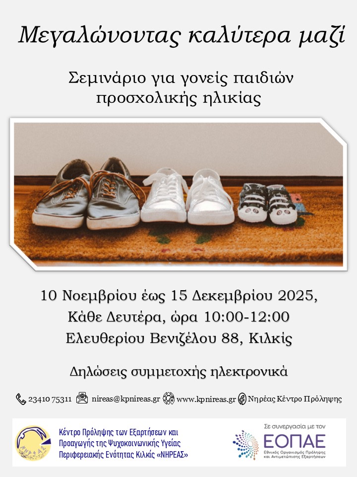 Το Κέντρο Πρόληψης των Εξαρτήσεων & Προαγωγής της Ψυχοκοινωνικής Υγείας Περιφερειακής Ενότητας Κιλκίς «ΝΗΡΕΑΣ» που λειτουργεί σε συνεργασία με τον Εθνικό Οργανισμό Πρόληψης και Αντιμετώπισης Εξαρτήσεων-Ε.Ο.Π.Α.Ε. πρόκειται να υλοποιήσει βιωματικό σεμινάριο για γονείς παιδιών προσχολικής ηλικίας με τίτλο: «Μεγαλώνοντας καλύτερα μαζί». Απευθύνεται σε γονείς/κηδεμόνες/φροντιστές (ανεξαρτήτου φύλου, κοινωνικό-οικονομικής κατάστασης, εργασιακής κατάστασης, εθνικότητας κ.ά.) που μεγαλώνουν παιδιά ηλικίας 0-5 χρονών και είναι μόνιμοι κάτοικοι της Περιφερειακής Ενότητας Κιλκίς.